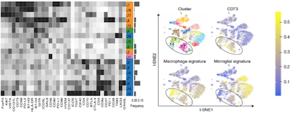 2019年12月,Nature Medicine發(fā)表對(duì)免疫檢查點(diǎn)治療效果好和不好的5種癌癥類(lèi)型,共94例患者進(jìn)行單細(xì)胞蛋白和單細(xì)胞RNA測(cè)序,在多形性膠質(zhì)母細(xì)胞瘤中發(fā)現(xiàn)了一個(gè)獨(dú)特的CD73hi巨噬細(xì)胞群,在抗PD-1治療后仍然存在。通過(guò)構(gòu)建CD73敲除鼠發(fā)現(xiàn)CD73的缺失提高了抗CTLA-4和抗PD-1治療的多形性膠質(zhì)母細(xì)胞瘤小鼠模型的存活率。證實(shí)CD73是一種特異性的免疫治療靶點(diǎn),可提高多形性膠質(zhì)母細(xì)胞瘤免疫檢查點(diǎn)治療的抗腫瘤免疫應(yīng)答。
