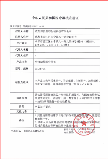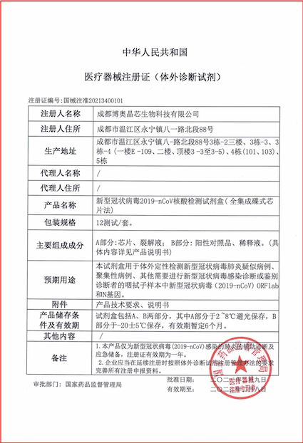 2021年2月10日,恰逢新春佳節(jié)來臨之際,依托國家科技部應(yīng)急攻關(guān)項目,博奧聯(lián)合清華大學成功研發(fā)的由新型冠狀病毒2019-nCoV核酸檢測試劑盒(全集成碟式芯片法)(國械注準:20213400101)和全自動核酸分析儀(國械注準:20213220102)組成的全集成芯片實驗室獲國家藥監(jiān)局應(yīng)急審批批準,為全國新冠肺炎疫情防控提供現(xiàn)場快速檢測“芯”利器。