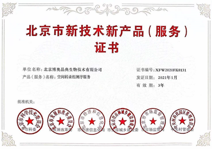 “北京市新技術(shù)新產(chǎn)品(服務(wù))認(rèn)定”旨在推動(dòng)高新技術(shù)產(chǎn)業(yè)的發(fā)展,作為北京市新技術(shù)新產(chǎn)品,應(yīng)擁有自主知識(shí)產(chǎn)權(quán),并具有技術(shù)先進(jìn)性和創(chuàng)新性。本次喜獲“空間轉(zhuǎn)錄組測序服務(wù)”榮譽(yù)證書是各委員會(huì)對(duì)博奧晶典創(chuàng)新能力的高度贊揚(yáng)和肯定,同時(shí)體現(xiàn)了博奧晶典空間轉(zhuǎn)錄組測序服務(wù)在行業(yè)內(nèi)的技術(shù)優(yōu)勢(shì)。