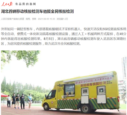 在武漢全員核酸檢測(cè)過程中,有這樣一抹亮色,馳騁在武漢抗疫前線,它就是博奧晶典新冠病毒核酸檢測(cè)移動(dòng)實(shí)驗(yàn)室。由清華大學(xué)、生物芯片北京國(guó)家工程研究中心和北京博奧晶典生物技術(shù)有限公司共同研發(fā)的新冠病毒核酸檢測(cè)移動(dòng)實(shí)驗(yàn)室是國(guó)內(nèi)首臺(tái)集采集和檢測(cè)為一體的移動(dòng)式新冠病毒檢測(cè)實(shí)驗(yàn)室,同時(shí)也是全國(guó)首款由輕型客車裝載的移動(dòng)實(shí)驗(yàn)室,被鐘南山院士命名為“輕騎兵”。