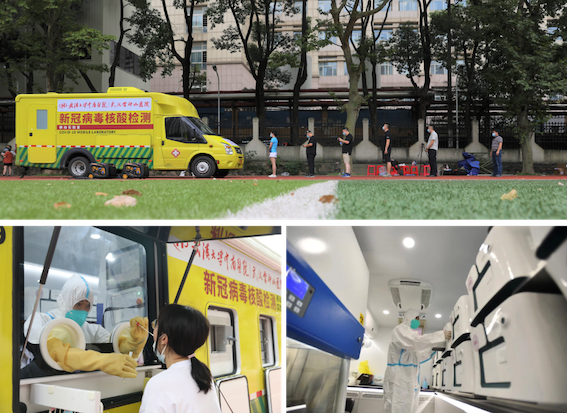 作為科技抗疫的標(biāo)志性成果,新冠病毒核酸檢測(cè)移動(dòng)實(shí)驗(yàn)室可以讓核酸檢測(cè)更加準(zhǔn)確便捷,安全快速,接通220V民用電或啟動(dòng)車上自帶的發(fā)電機(jī)即可正常工作,采樣可通過口咽拭子采樣機(jī)械臂和人工兩種方式完成。其裝載的全集成芯片實(shí)驗(yàn)室系統(tǒng)45分鐘即可完成全程實(shí)驗(yàn),最快35分鐘報(bào)告陽(yáng)性結(jié)果,檢測(cè)靈敏度可達(dá)150拷貝/毫升。如此出色的性能使其特別適合在社區(qū)發(fā)生聚集性疫情和縣鄉(xiāng)村等醫(yī)療條件相對(duì)較差的場(chǎng)景下發(fā)揮優(yōu)勢(shì)。在為市民完成檢測(cè)后,檢測(cè)結(jié)果會(huì)通過5G通信系統(tǒng)實(shí)時(shí)上傳到醫(yī)院的核酸檢測(cè)實(shí)驗(yàn)室,經(jīng)過審核后上報(bào)武漢市衛(wèi)健委的核酸檢測(cè)系統(tǒng)?!拜p騎兵”每天可以完成近800份樣品的檢測(cè),為武漢市全民核酸檢測(cè)提供有力支持,在此次武漢疫情中發(fā)揮了積極作用。