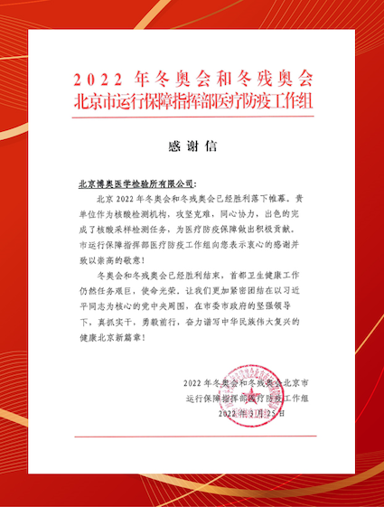 作為戰(zhàn)疫國(guó)家隊(duì)成員,在此次北京冬奧會(huì)和冬殘奧會(huì)期間,博奧晶典承擔(dān)了為來(lái)自世界各地的國(guó)家元首、政府首腦、王室成員和國(guó)際組織負(fù)責(zé)人等重要來(lái)賓提供實(shí)時(shí)就地核酸檢測(cè)以及人員和環(huán)境樣本的核酸檢測(cè)任務(wù),以硬核“芯”科技賦能奧運(yùn),收獲了來(lái)自冬奧會(huì)和冬殘奧會(huì)北京市運(yùn)行保障指揮部醫(yī)療防疫工作組的感謝、表?yè)P(yáng)和點(diǎn)贊。
