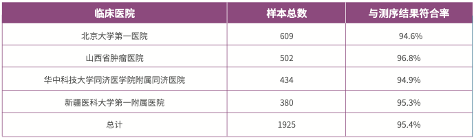 1925 例來自北京大學第一醫(yī)院、山西省腫瘤醫(yī)院等醫(yī)療機構(gòu)的臨床樣本使用 HPV 檢測試劑盒檢測結(jié)果表明:對于 HPV 感染陽性的樣本,芯片檢測結(jié)果與 DNA 測序結(jié)果比較,符合率在 95% 以上。