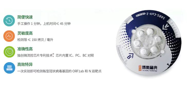 本產(chǎn)品采用博奧自主研發(fā)的微流控集成式核酸提取純化和高靈敏度擴(kuò)增檢測技術(shù),由國家科技部“新型冠狀病毒感染的肺炎疫情應(yīng)急項(xiàng)目”支持,能快速精準(zhǔn)地完成對新型冠狀病毒的“樣本進(jìn)—結(jié)果出”式全自動、全密閉檢測。特殊工藝制作的微流控芯片上集成了樣本裂解、核酸提取、巢式擴(kuò)增和熒光檢測等功能,通過芯片巢式恒溫?cái)U(kuò)增技術(shù),實(shí)現(xiàn)對痕量病毒核酸高敏擴(kuò)增和檢測,每張芯片可檢測兩個(gè)樣本,能在45分鐘內(nèi)一步完成全程實(shí)驗(yàn),達(dá)到對新型冠狀病毒核酸的快速檢測。(國械注準(zhǔn):20213400101)