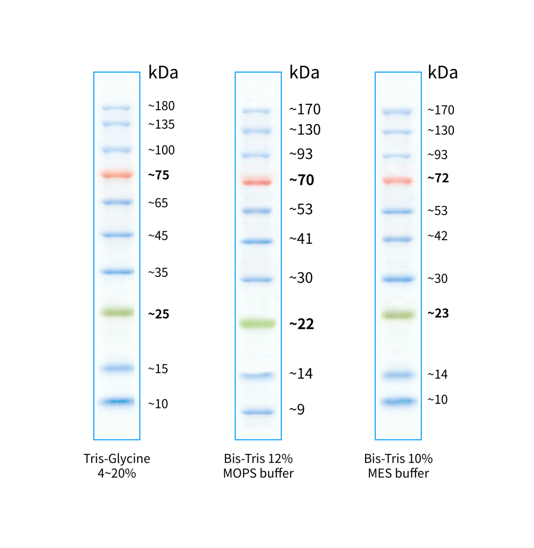 本產(chǎn)品由跨度從 10-180 kDa 的 10 種高度純化預(yù)染的重組蛋白質(zhì)組成,各條帶濃度約為 0.2-0.4 mg/ml。其中 25 kDa 條帶為綠色預(yù)染條帶,75 kDa 條帶為紅色預(yù)染條帶,方便判斷各個(gè)條帶的準(zhǔn)確位置。本產(chǎn)品適合作為 SDS-PAGE 電泳時(shí),變性蛋白樣品的分子量參照,并可實(shí)時(shí)觀察蛋白樣品的電泳分離狀況,也可用于檢測(cè) Western blot 的轉(zhuǎn)膜效率。由于共價(jià)結(jié)合的染料會(huì)影響蛋白質(zhì)分子的電泳遷移率,本產(chǎn)品僅適于粗略地估計(jì)目的蛋白樣品的分子量。