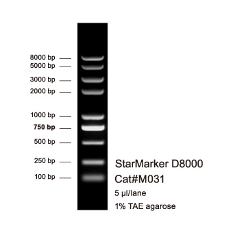 本產品為預混有 1× 上樣緩沖液的即用型 DNA 分子量標準,由 9 條線狀雙鏈 DNA 條帶組成,適用于對 100-8000 bp 的雙鏈 DNA 分子大小的估算和粗略定量。本產品的 9 條帶分別為 100、250、500、750、1000、2000、3000 和 5000 bp、8000 bp。其中 750 bp 條帶濃度最大,為 100 ng/5 µl,其余條帶濃度約為 50 ng/5 µl。