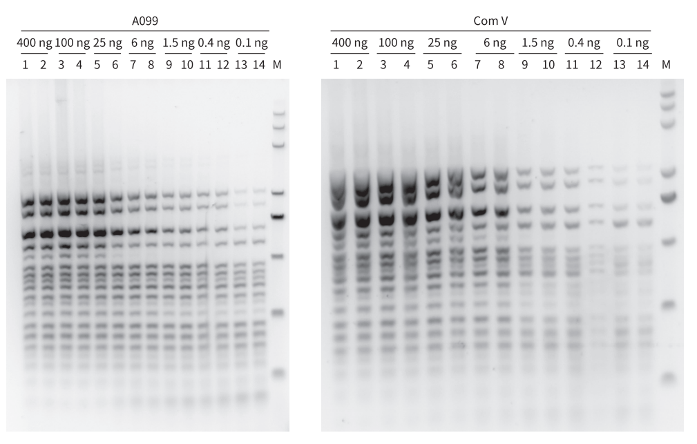 以 Human 基因組為模板,同時擴增 19 個目的片段。結(jié)果顯示,A099 最低檢測限可達(dá) 0.1 ng,不會出現(xiàn)條帶丟失且條帶清晰優(yōu)于 Com V
