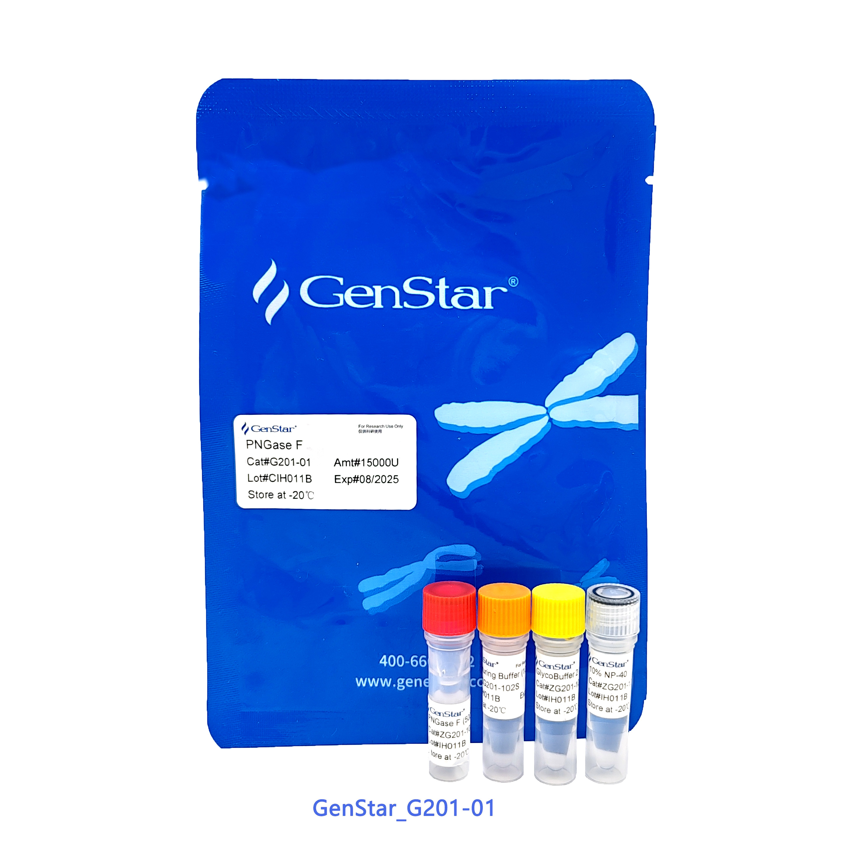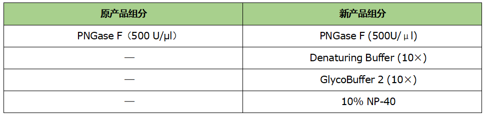 自 2024.08 起,G201 產(chǎn)品進行了組分變更。變更后的產(chǎn)品提供肽 N-糖苷酶 F 適配的三種反應(yīng) buffer 即 Denaturing Buffer (10×)、GlycoBuffer 2 (10×)和 10% NP-40,使產(chǎn)品使用更加便捷。