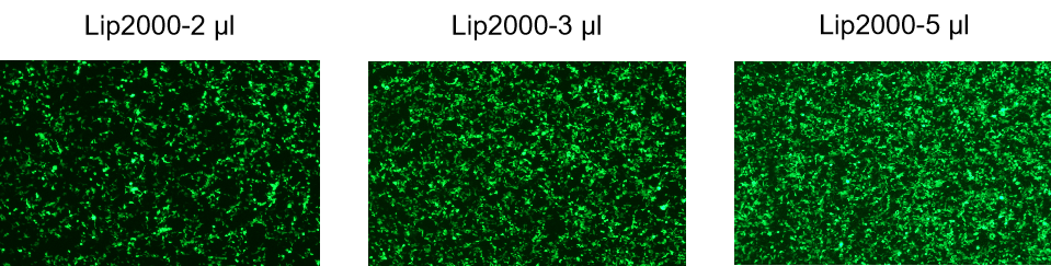 使用不同量的 GenStar#C105(2 μl、3μl、5μl),將1 μg質(zhì)粒DNA轉(zhuǎn)染293T細(xì)胞。結(jié)果顯示,在推薦使用量范圍內(nèi),加大轉(zhuǎn)染試劑量可提高轉(zhuǎn)染效率。