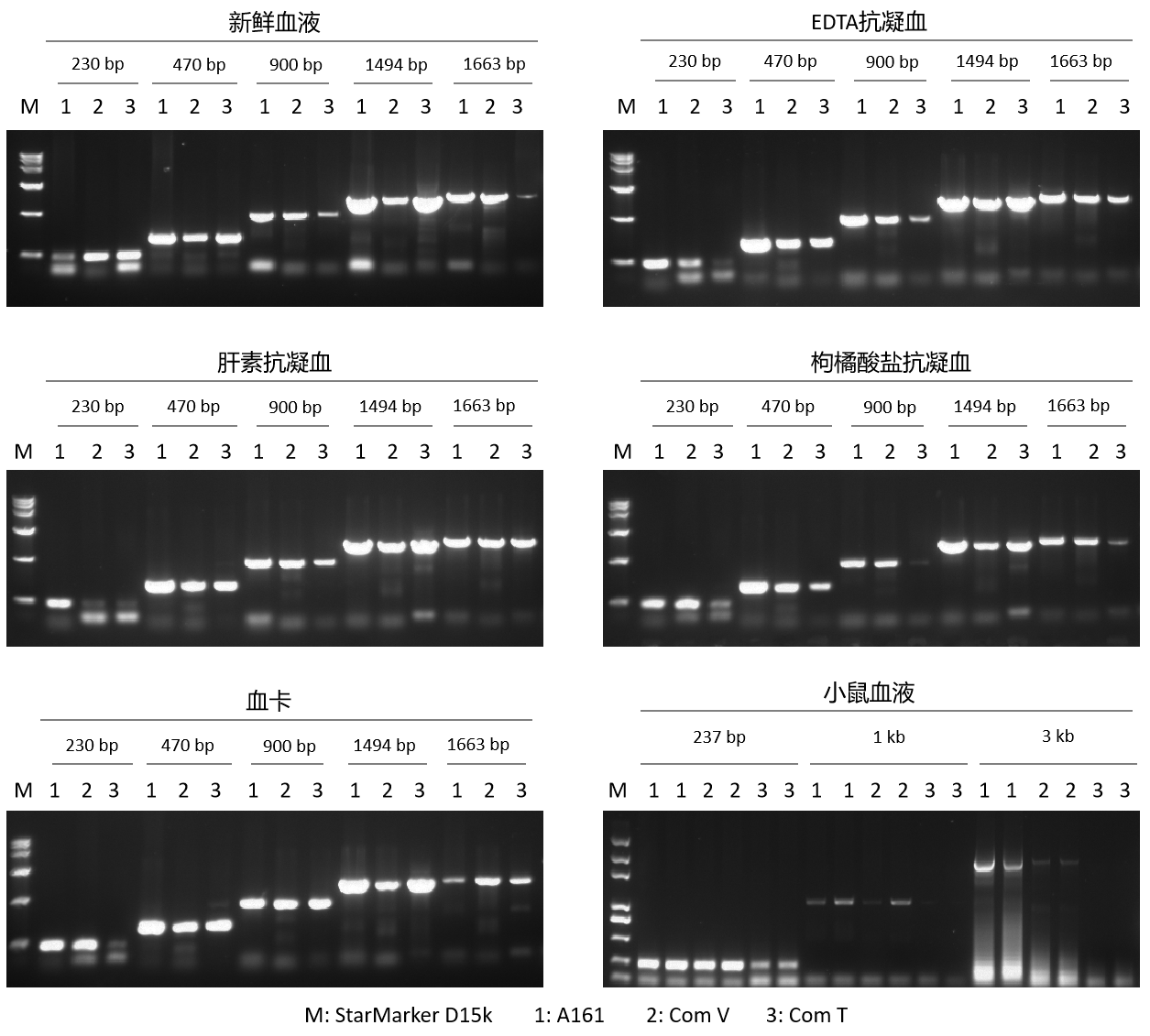 以人的新鮮血液、常規(guī)的抗凝血(EDTA、肝素、枸橘酸鹽)、血卡、小鼠新鮮血液為模板,分別使用 A161、Com V 和 Com T 進(jìn)行 PCR 擴(kuò)增。結(jié)果顯示,A161 具有超強(qiáng)的抑制劑耐受性,可對(duì)不同類(lèi)型血液樣本進(jìn)行 PCR 擴(kuò)增,且擴(kuò)增性能優(yōu)于 Com V 和 Com T。