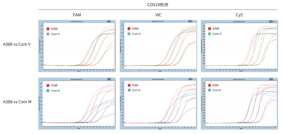 以不同濃度的 COV19 為模板,分別用 A388、 Com V 、Com M 進(jìn)行檢測(cè)。結(jié)果顯示,A388 和 Com V、Com M 擴(kuò)增效果相當(dāng),A388 擴(kuò)增曲線(xiàn)和熒光強(qiáng)度優(yōu)于 Com M