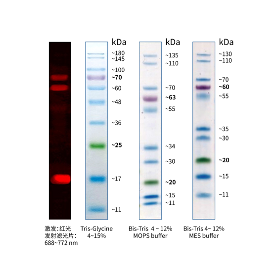 本產(chǎn)品由跨度從 11-180 kDa 的 10 種高度純化預(yù)染的重組蛋白質(zhì)組成。10 種條帶分別為:11、17、25、36、48、60、70、100、145、180 kDa。其中 25 kDa 條帶為綠色預(yù)染條帶,70 kDa 條帶為紫色預(yù)染條帶,17、60、70 kDa 三個條帶可用于紅色波長(635 nm 激光或紅色 LED )的熒光印跡檢測,方便判斷各個條帶準(zhǔn)確位置。