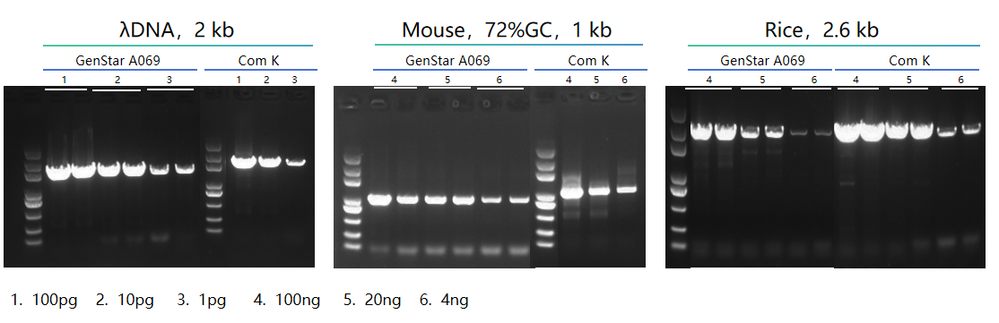 GenStar 2×SuperNova HTS PCR Mix(#A069) 靈敏度與 Com K 相當(dāng),對(duì)于簡單模板(如 λDNA),模板濃度可檢測(cè)低至 pg 級(jí)。