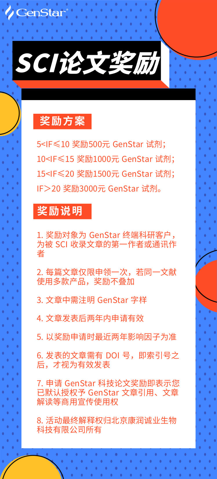 GenStar 自成立以來,一直深耕于分子生物學(xué)領(lǐng)域上游核心原料及配套體系的研發(fā),服務(wù)了全國數(shù)千家實(shí)驗(yàn)室的科研人員。使用 GenStar 產(chǎn)品的 SCI 論文總數(shù)已達(dá)千余篇,其中包含《Nature》、《Science》、《Cell》等高水平的學(xué)術(shù)期刊。為了感謝廣大客戶的支持與信任,GenStar 繼續(xù)推行發(fā)表科技論文獎勵機(jī),使用 GenStar 產(chǎn)品發(fā)表科技論文的人員均可申請。希望更多新老客戶參與其中,期待和您一起分享成功的喜悅。