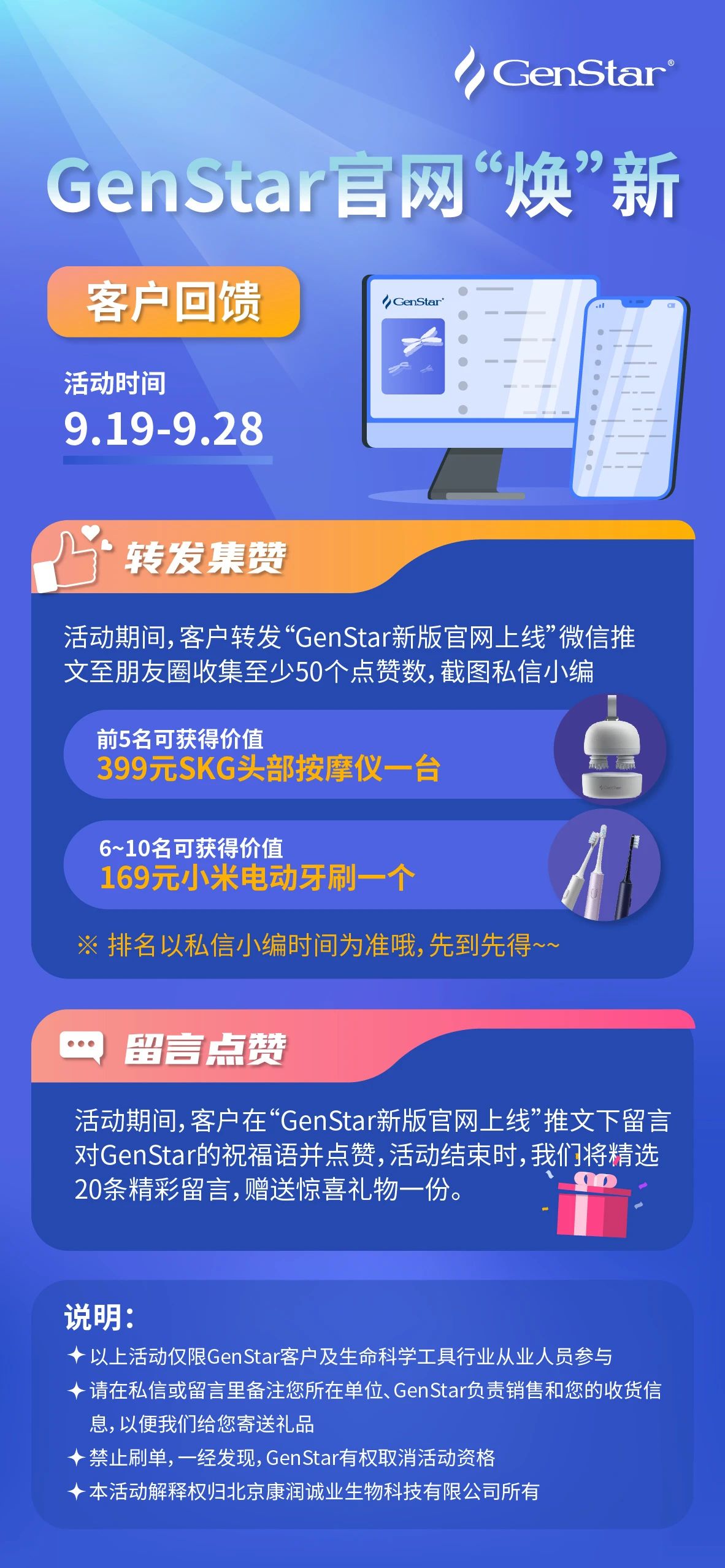 1. 轉(zhuǎn)發(fā)GenStar公眾號推文(可點擊此處跳轉(zhuǎn))至朋友圈點贊數(shù)滿50,截圖私信GenStar公眾號鎖定禮品,滿24h后再次截圖并備注單位,負(fù)責(zé)銷售和收貨信息。無文章保留24h截圖視為棄權(quán),獲獎?wù)唔樠右晃弧?/span>