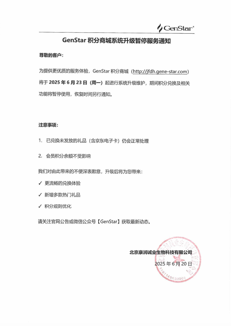 GenStar積分商城系統(tǒng)升級暫停服務通知