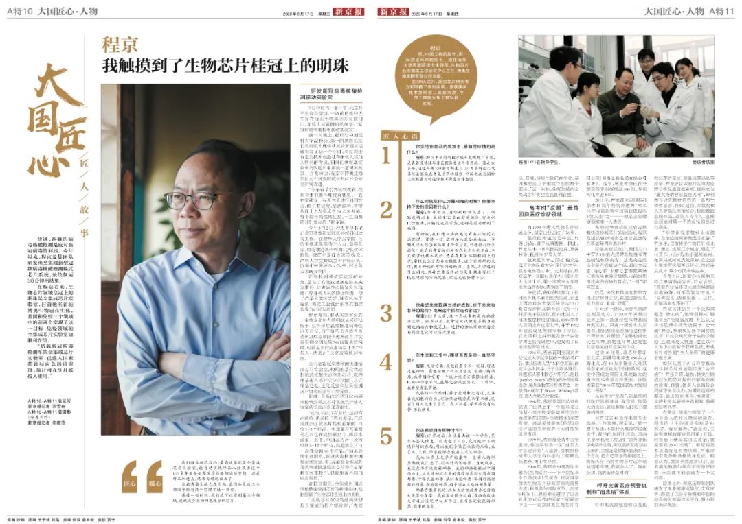 各方凝聚起的“工匠”精神賦予我們跨越山海的底氣。9月17日,新京報推出2020“大國匠心”致敬特刊,其中《匠心·聚力-2020年大國匠心年度人物》特刊A10-11兩整版報道了2020年度大國匠心年度人物-中國工程院院士、清華大學(xué)醫(yī)學(xué)院講席教授、博奧生物集團有限公司總裁程京帶領(lǐng)團隊在新冠肺炎疫情期間攻堅克難、研發(fā)多項抗疫核心技術(shù),以及程京院士在過去幾十年為之奮斗不止的“芯路歷程”。