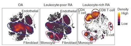 2019年5月,Nature Immunology報(bào)道關(guān)于類(lèi)風(fēng)濕性關(guān)節(jié)炎(RA)的研究。作者對(duì)來(lái)自RA或骨關(guān)節(jié)炎(OA)患者的51個(gè)滑膜組織樣品的T細(xì)胞、B細(xì)胞、單核細(xì)胞和成纖維細(xì)胞進(jìn)行單細(xì)胞RNA測(cè)序(scRNA-seq)、質(zhì)譜流式檢測(cè)、 轉(zhuǎn)錄組測(cè)序(bulk RNA-seq)和普通流式細(xì)胞檢測(cè)。利用基于5,265個(gè)scRNA-seq圖譜典型相關(guān)分析的綜合策略,作者鑒定了18個(gè)獨(dú)特的細(xì)胞群。通過(guò)在單細(xì)胞層面對(duì)跨數(shù)據(jù)模態(tài)進(jìn)行整合,精確定義了特定細(xì)胞亞群在RA和慢性炎癥中的作用。