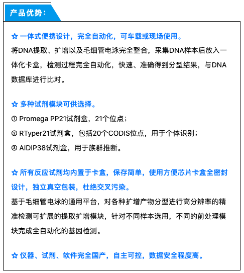 該系統(tǒng)基于微流控芯片技術(shù),配套全集成芯片卡盒和數(shù)據(jù)分析軟件,集DNA提取、PCR擴(kuò)增、毛細(xì)管電泳于一體,自動(dòng)生成分型結(jié)果,2小時(shí)即可獲得DNA分型。既可用于重大事故、自然災(zāi)害的人員身份快速識(shí)別和案件現(xiàn)場檢材的快檢快篩,也可用于邊防、公安等基層機(jī)關(guān)對敏感、可疑人員身份的快速識(shí)別和排查。儀器操作簡單便捷,無需專業(yè)技術(shù)人員操作,可檢測的樣本包括:血卡、唾液卡、口腔拭子卡等。無使用環(huán)境要求,既可在實(shí)驗(yàn)室、辦公室、窗口單位,也可與警用現(xiàn)勘車配套移動(dòng)式檢測,具有良好的抗震性、防污染措施,使用無需校準(zhǔn)。同時(shí)兼容多款國內(nèi)外DNA試劑,具備個(gè)體識(shí)別和族群推斷功能。