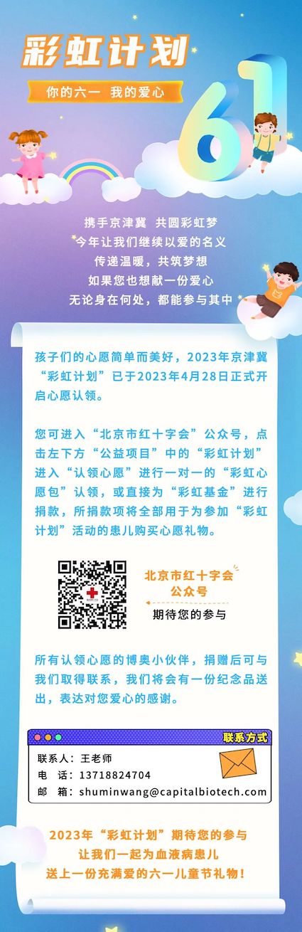 為了更好地關(guān)心、關(guān)愛血液病患兒,使更多人了解和加入造血干細胞捐獻公益事業(yè),2009年中華骨髓庫和新京報聯(lián)合發(fā)起了“你的六一,我的愛心”公益活動,呼吁全社會關(guān)注血液病兒童,為他們送上小小的兒童節(jié)禮物,讓他們感受到來自陌生人的溫暖。此后的每一年,北京市紅十字會和志愿者把這個公益項目延續(xù)至今。2016年起,京津冀三地紅十字會、志愿者和愛心人士一起以“攜手京津冀、共圓彩虹夢”為主題,將這個項目發(fā)展、壯大。