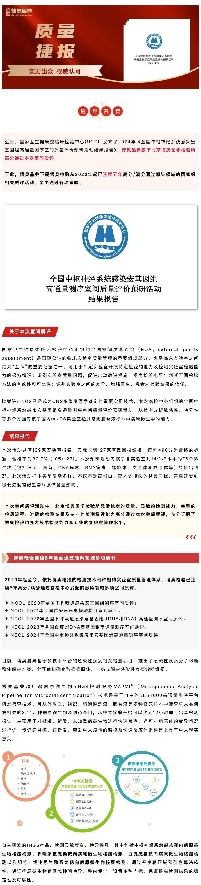捷報丨全國中樞神經(jīng)系統(tǒng)感染mNGS室間質(zhì)評結(jié)果發(fā)布,博奧檢驗連續(xù)5年全面通過感染領(lǐng)域多項質(zhì)評