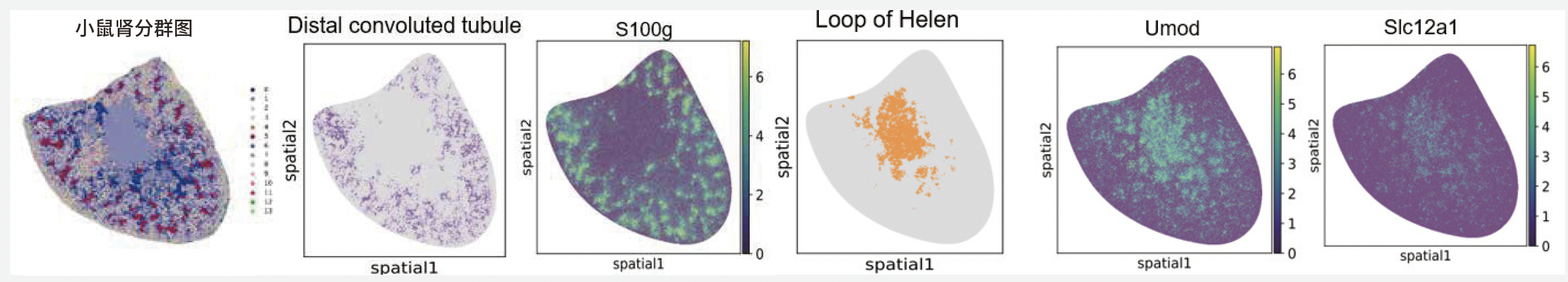 使用博奧晶典高分辨率空間轉(zhuǎn)錄組平臺(tái), 構(gòu)建了小鼠腎的高分辨率空間轉(zhuǎn)錄組圖譜,揭示了腎組織空間分區(qū)結(jié)構(gòu)(圖3)。其次,小鼠腎基因表達(dá)圖譜與HE 染色結(jié)果相結(jié)合可以清晰的了解各細(xì)胞類(lèi)群的基因表達(dá)及相互作用,揭示它們對(duì)疾病發(fā)生、發(fā)展、治療、預(yù)后評(píng)估的價(jià)值。