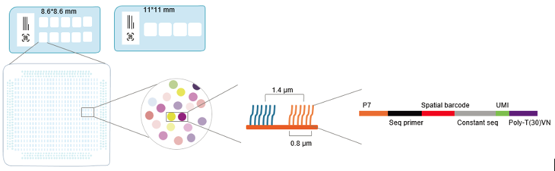 芯片包括兩種類(lèi)型:組織透化芯片和基因表達(dá)芯片,表達(dá)芯片捕獲區(qū)域面積為11*11mm。在捕獲區(qū)域內(nèi)存在著數(shù)千萬(wàn)的探針簇,每個(gè)探針簇的直徑為0.8 μm,每平方微米有約18000 條探針,用于捕獲轉(zhuǎn)錄本(圖1)。每條探針捕獲序列由5 部分組成 :