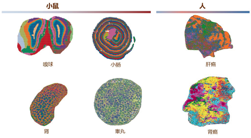 目前對(duì)人和小鼠的多種組織,包括嗅球、小腸、腎臟、肝等進(jìn)行空間轉(zhuǎn)錄實(shí)驗(yàn),繪制各種細(xì)胞類(lèi)型在組織中的精細(xì)空間分布(圖4)。