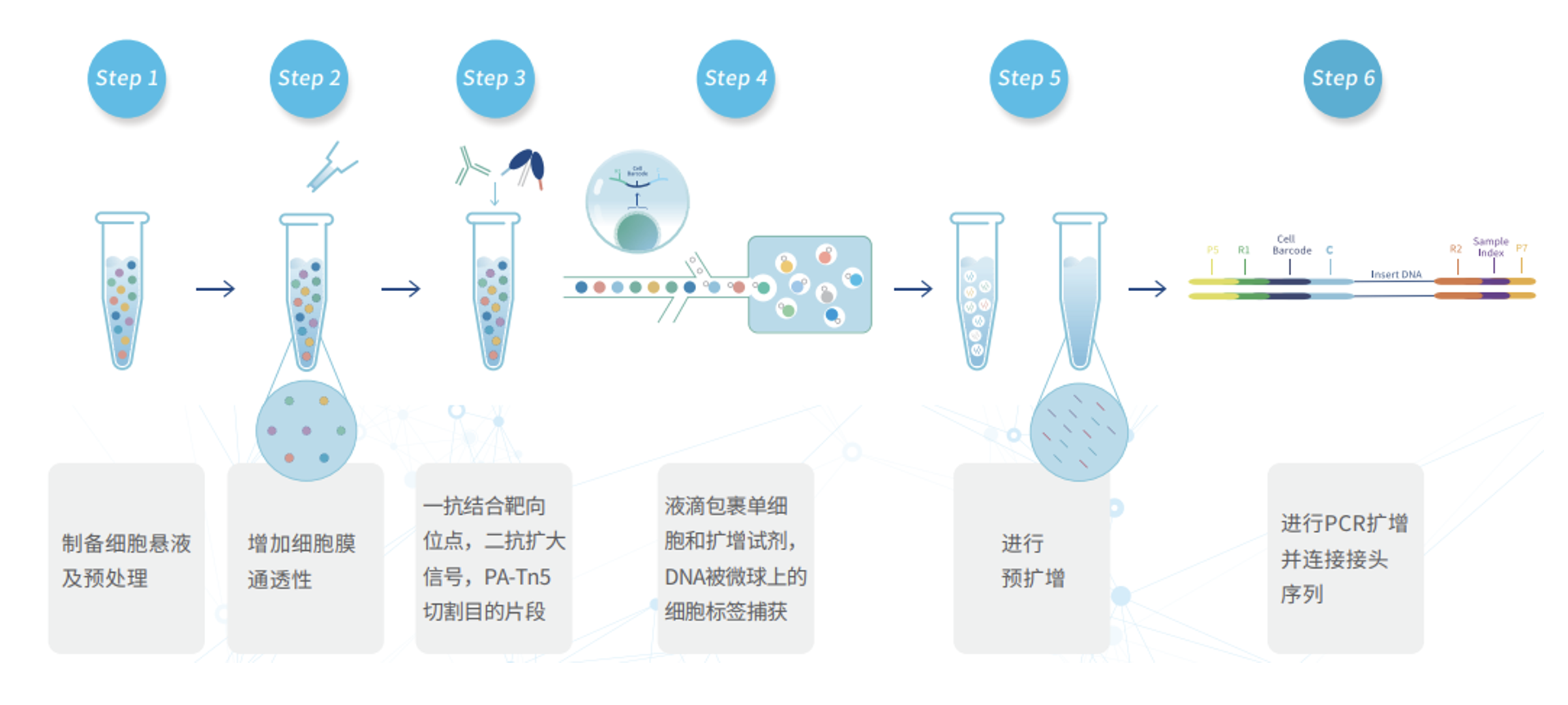 本試劑盒通過(guò)抗體和 Tn5 酶識(shí)別蛋白與 DNA 的結(jié)合位點(diǎn),并靶向切割 DNA 分子?;谝旱挝⒘骺丶夹g(shù)將經(jīng)過(guò)處理的單個(gè)細(xì)胞包裹形成油包水結(jié)構(gòu),并借助帶有細(xì)胞標(biāo)簽的微球捕獲 DNà 片段和標(biāo)記 DNA 分子,實(shí)現(xiàn)蛋白與 DNA 位點(diǎn)結(jié)合的測(cè)序,具有高通量、超高分辨率、超強(qiáng)特異性的特點(diǎn)。目前提供的檢測(cè)抗體:可選5種組蛋白修飾:H3K27ac、H3K4me1、H3K4me3、H3K27me3、H3K36me3;1種DNA結(jié)合蛋白:Rpb1(RNA聚合酶 Ⅱ)
